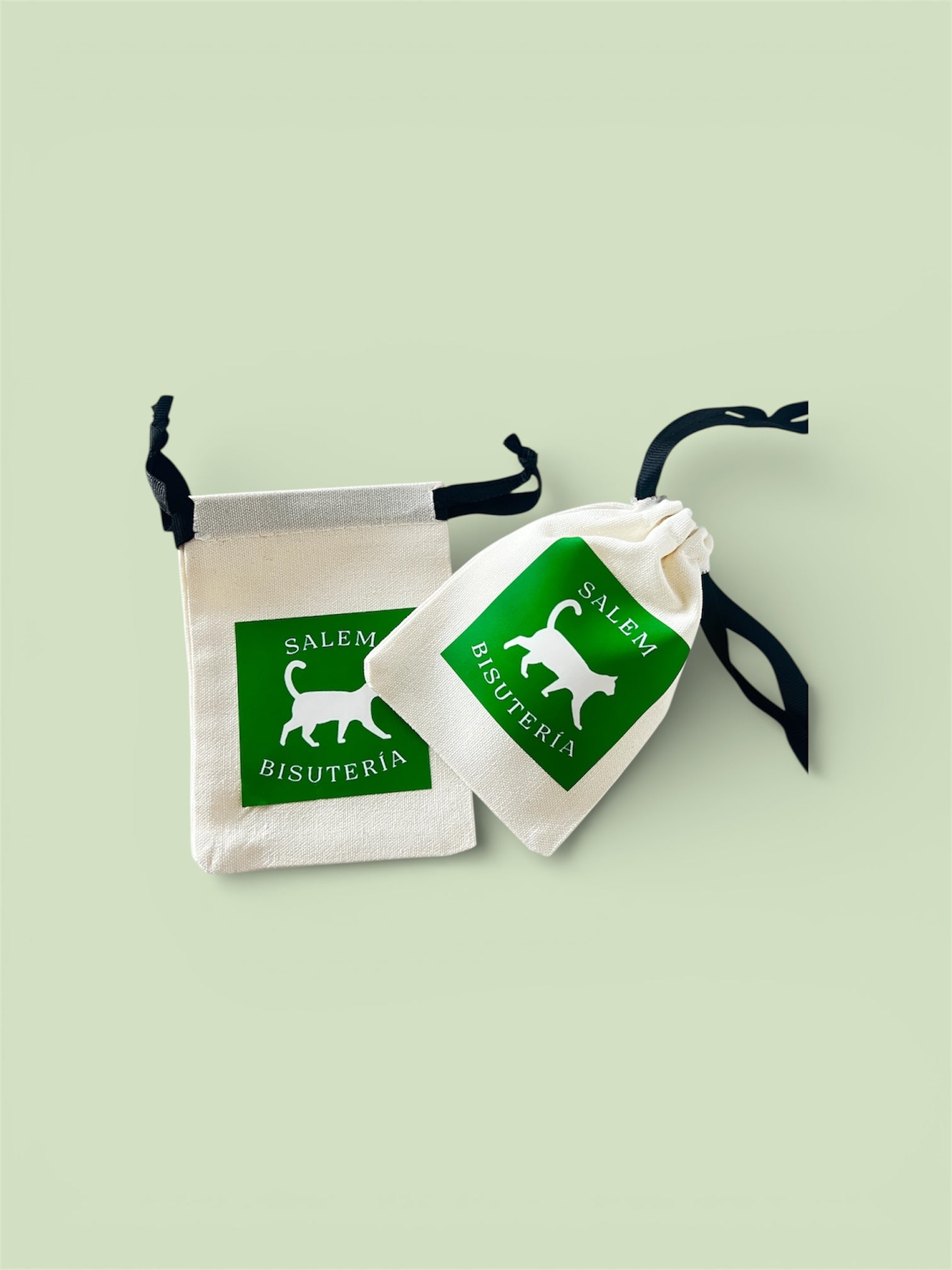 La bolsita regalo de aproximadamente 5x7 cm, elaborada en tela blanca, presenta un diseño con el logo de Salem en verde y blanco. Esta presentación es ideal para envolturas de regalo, proporcionando una apariencia elegante y profesional, lo que potencia la experiencia de obsequiar a un ser querido.