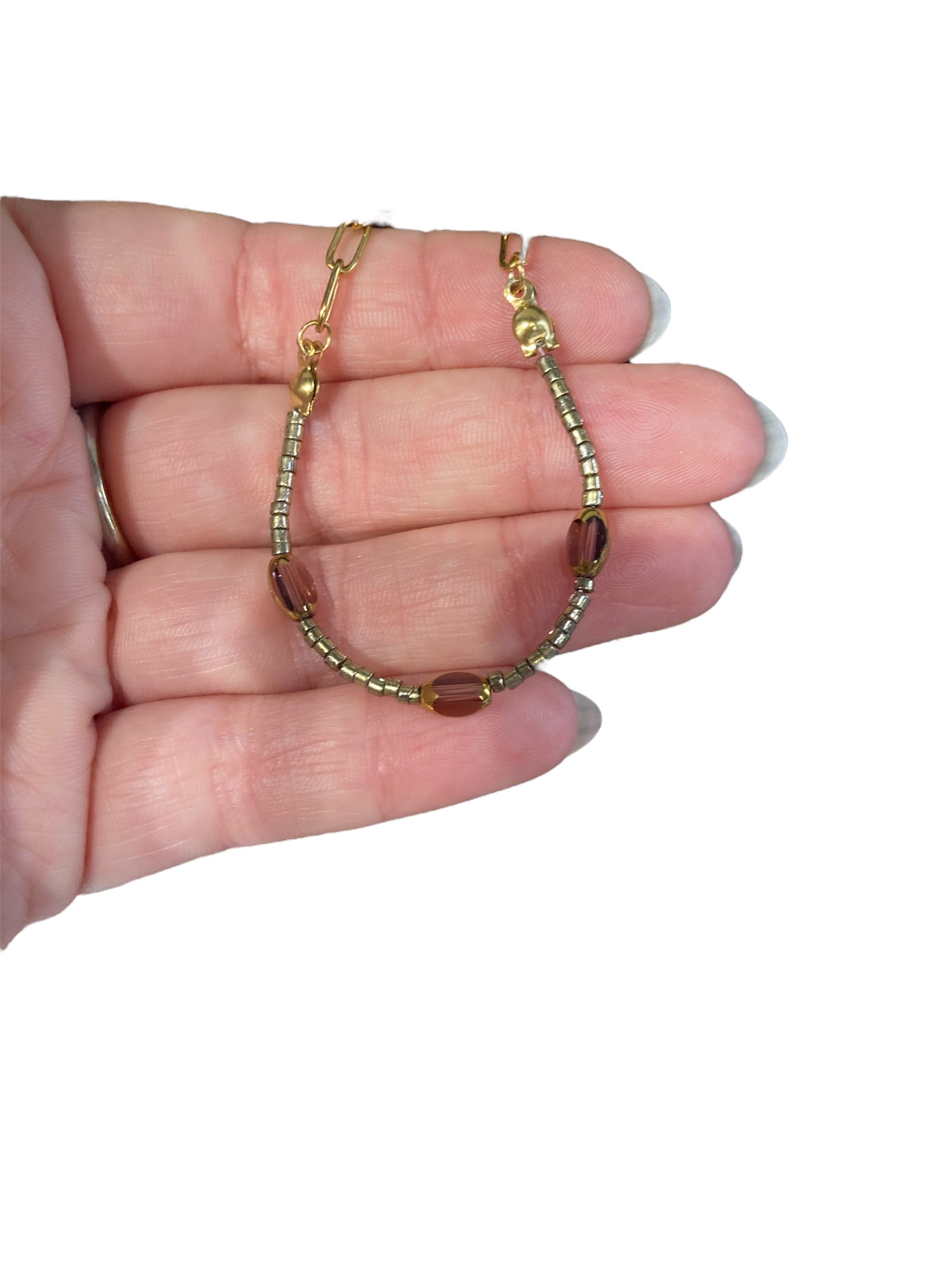 Material principal: Cuentas de cristal en color dorado y detalles alargados